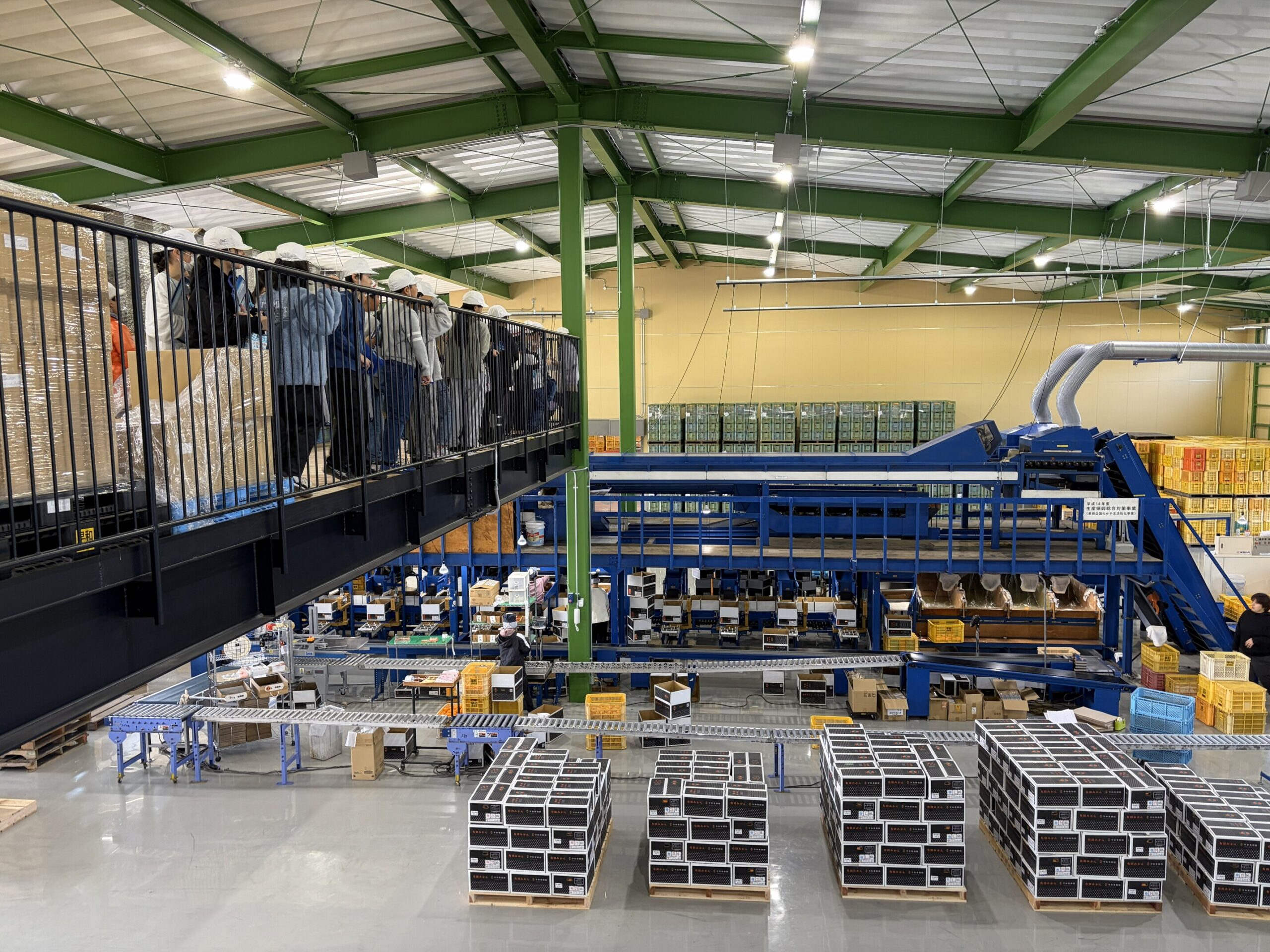 大型選果機が稼働していましたので、普段はなかなか行けない幻の3階から見学していただきました!大型選果機を見学するにはここがベストスポット。特別よ♥