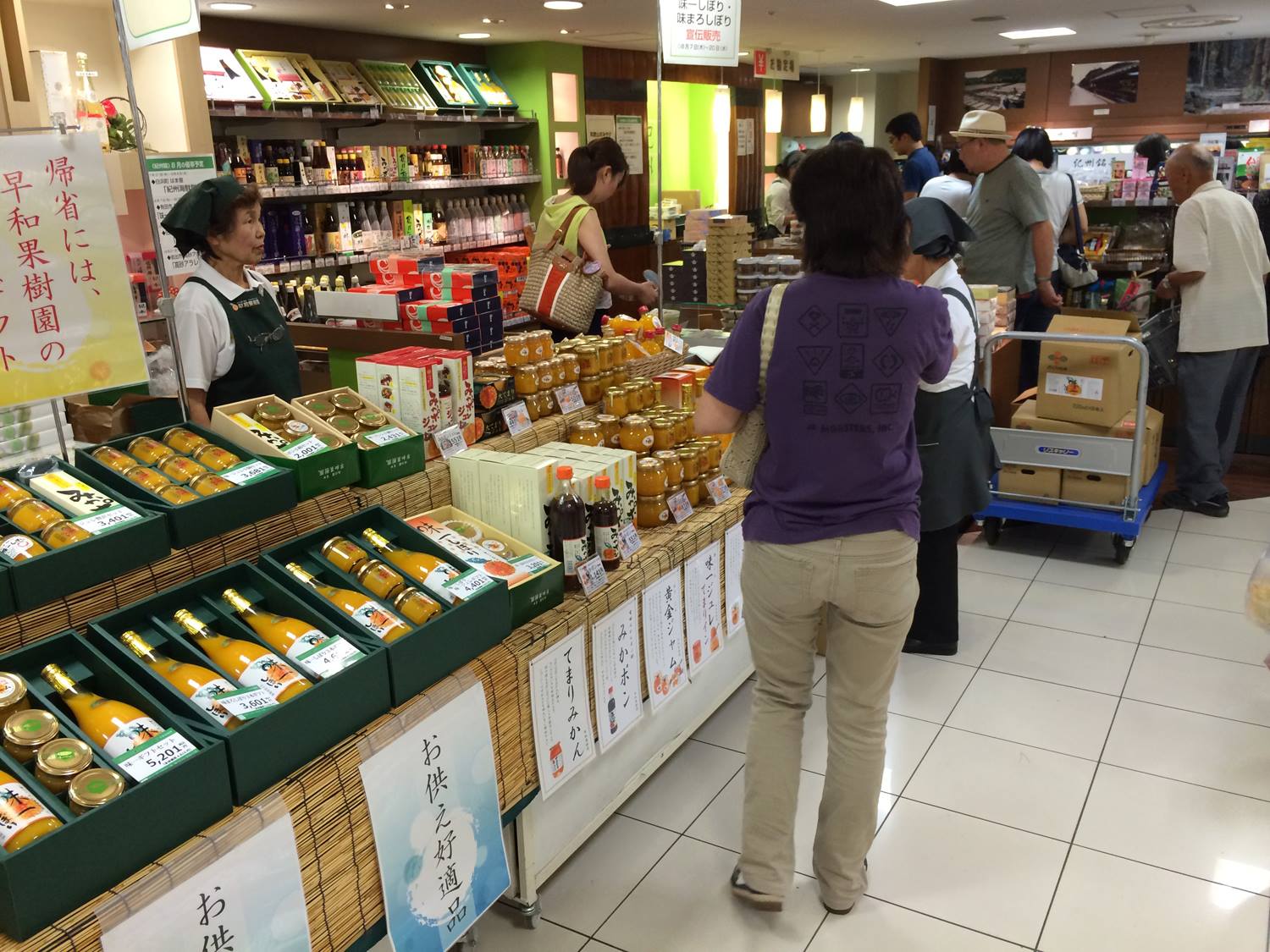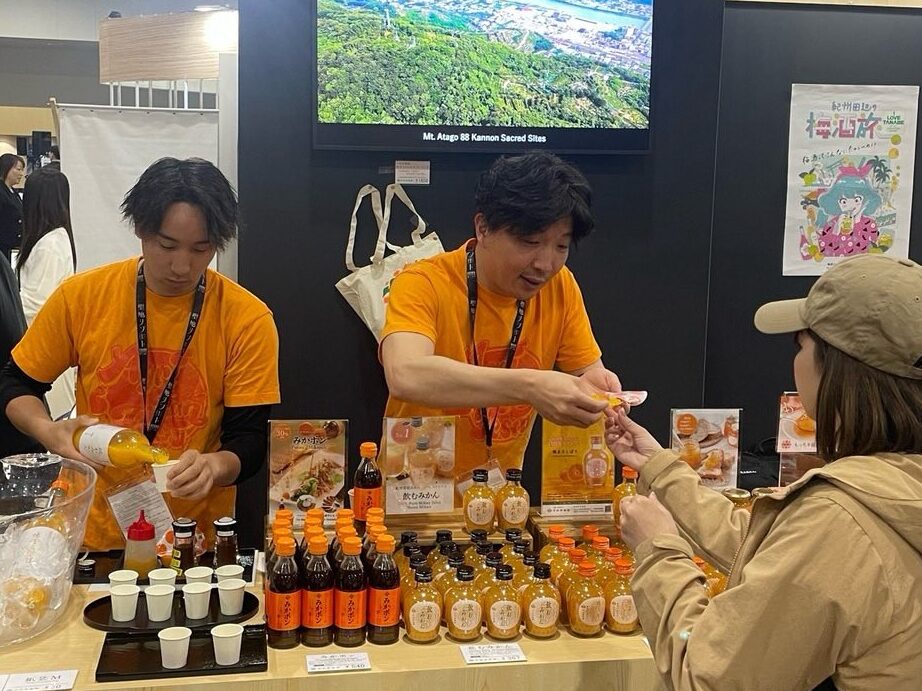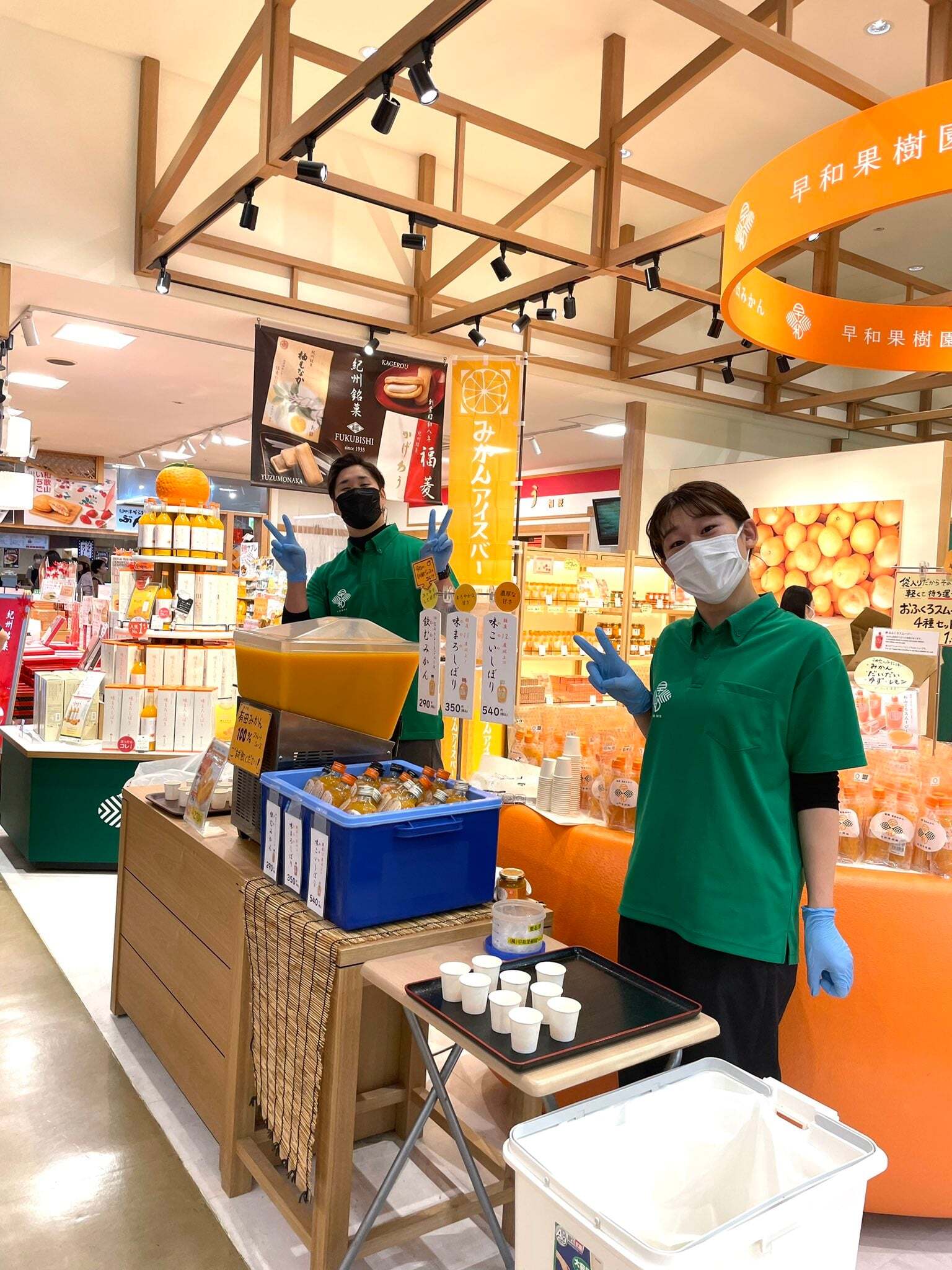 とれとれ市場内の早和果樹園南紀白浜店での試飲販売の様子 2025年5月には大阪・関西万博にも出店し、試飲販売を行いました🍊
