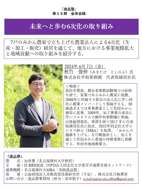 今回は、6/7に開催された、名古屋商科大学MBAの加登豊教授が主催する勉強会「逸品塾」に講師としてお招きいただきました。