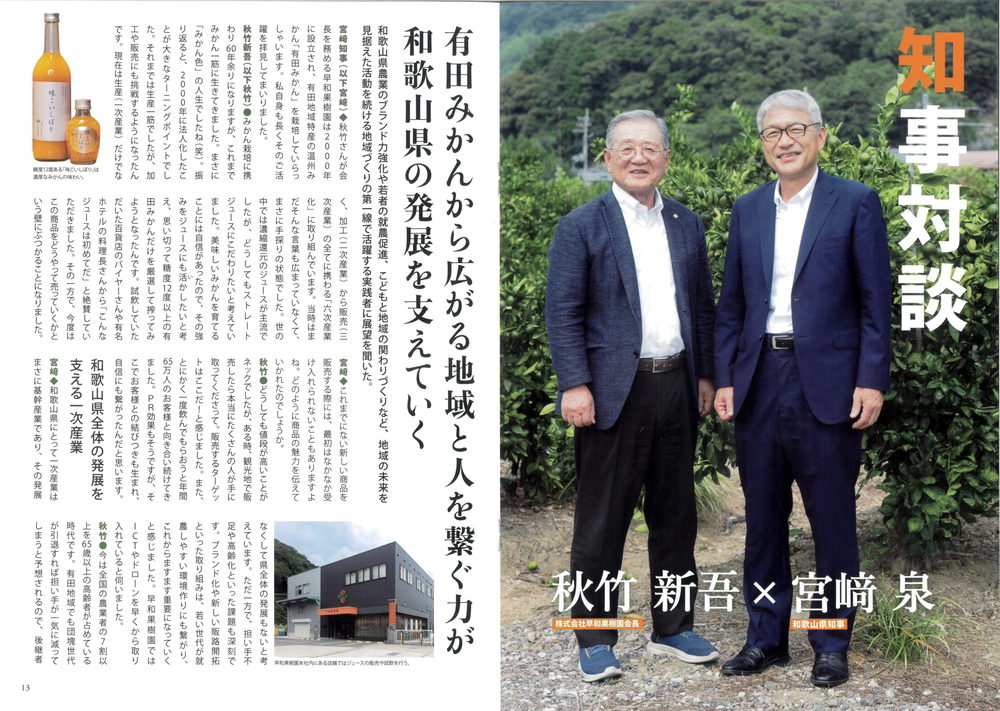 「有田みかんから広がる地域と人をつなぐ力が和歌山県の発展を支えていく」という見出しのもと、会社の成り立ちのエピソードや就農促進に向けた取り組みについてお話しさせていただいています。