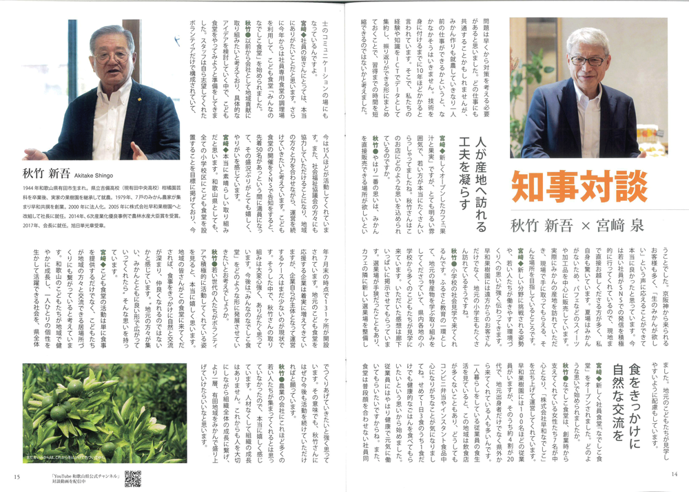 11月14日発行 和歌山県総合情報誌「和-nagomi-」の「知事対談」のコーナーにて、秋竹会長と宮﨑泉和歌山県知事との対談が掲載されました。