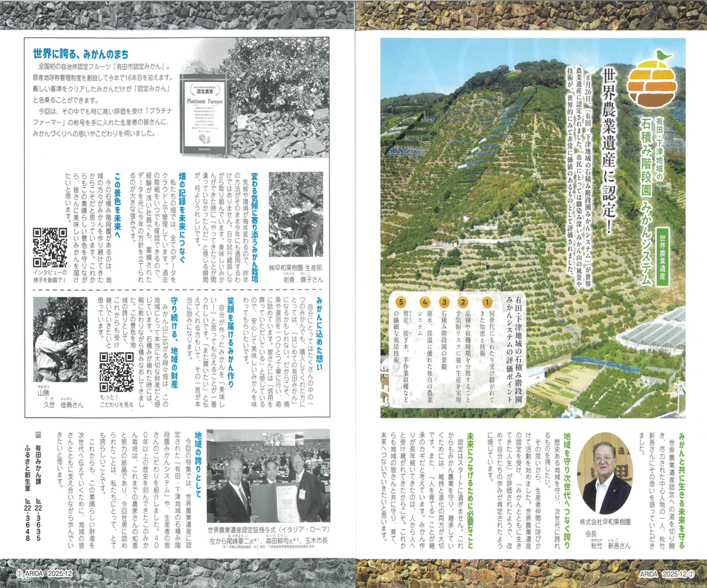 8月26日に「有田・下津地域の石積み階段園みかんシステム」が世界農業遺産に認定されたことを受け、今回の号では、世界農業遺産認定への道を切り開き尽力した中心人物の1人として、秋竹会長のみかんづくりや有田地域に対する思いを紹介していただいています。